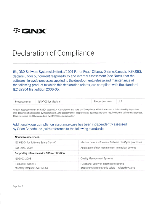 With the growing complexity of today’s medical devices, regulatory scrutiny is becoming more stringent. Choosing a pre-qualified component with a known pedigree can significantly aid in the qualification process. The QNX Neutrino RTOS for medical devices is qualified by an independent third party to be compliant with IEC 62304, a standard for "Medical device software – Software life cycle processes". The product is supported on ARM, Power, and x86 processors.
